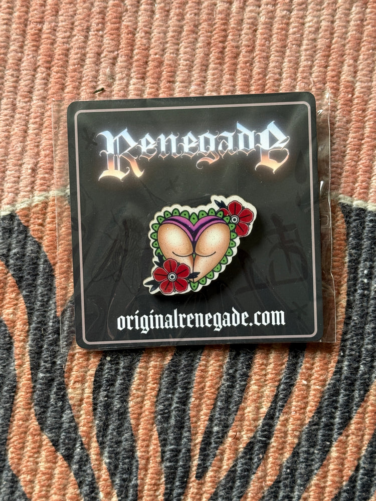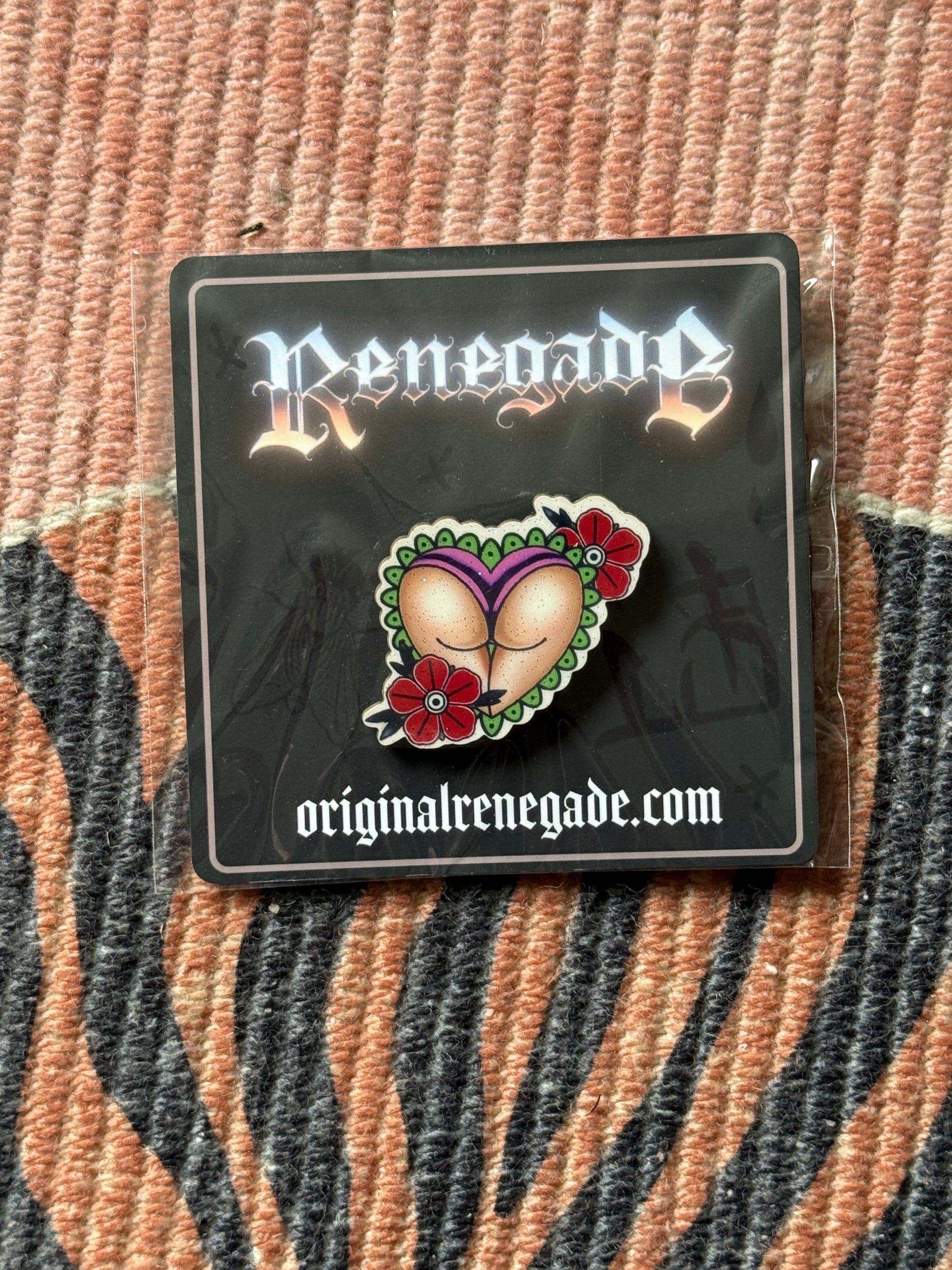 My most popular design, a bum with old school blossoms, as an acrylic badge, printed on high quality acrylic and built to last.