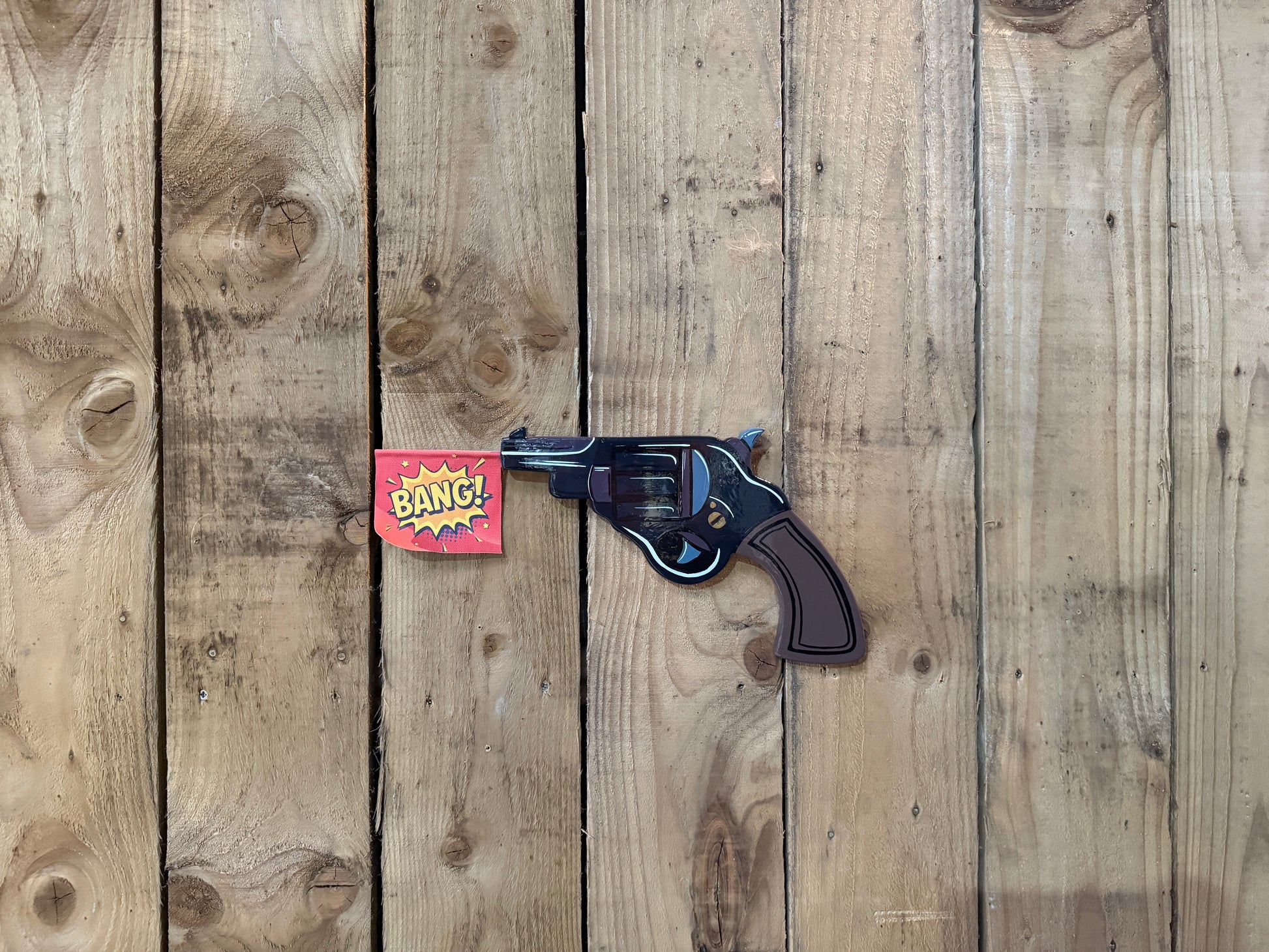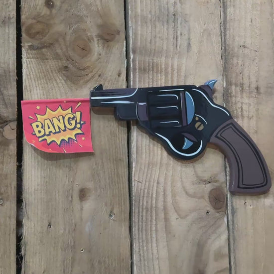Remember those fun Smith & Wesson 'BANG!' guns you has as a child? Here is one for you as an adult! Hand painted on wood this is a super fun piece, with some nostalgia too.