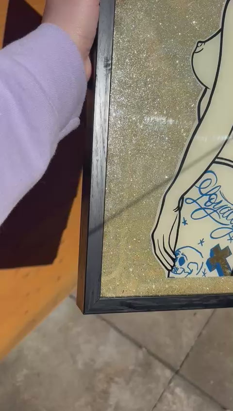 Hand painted on glass, 23ct gold leaf and super metallic gold glitter. This is a one of one piece, framed in a black frame which makes the gold really pop!